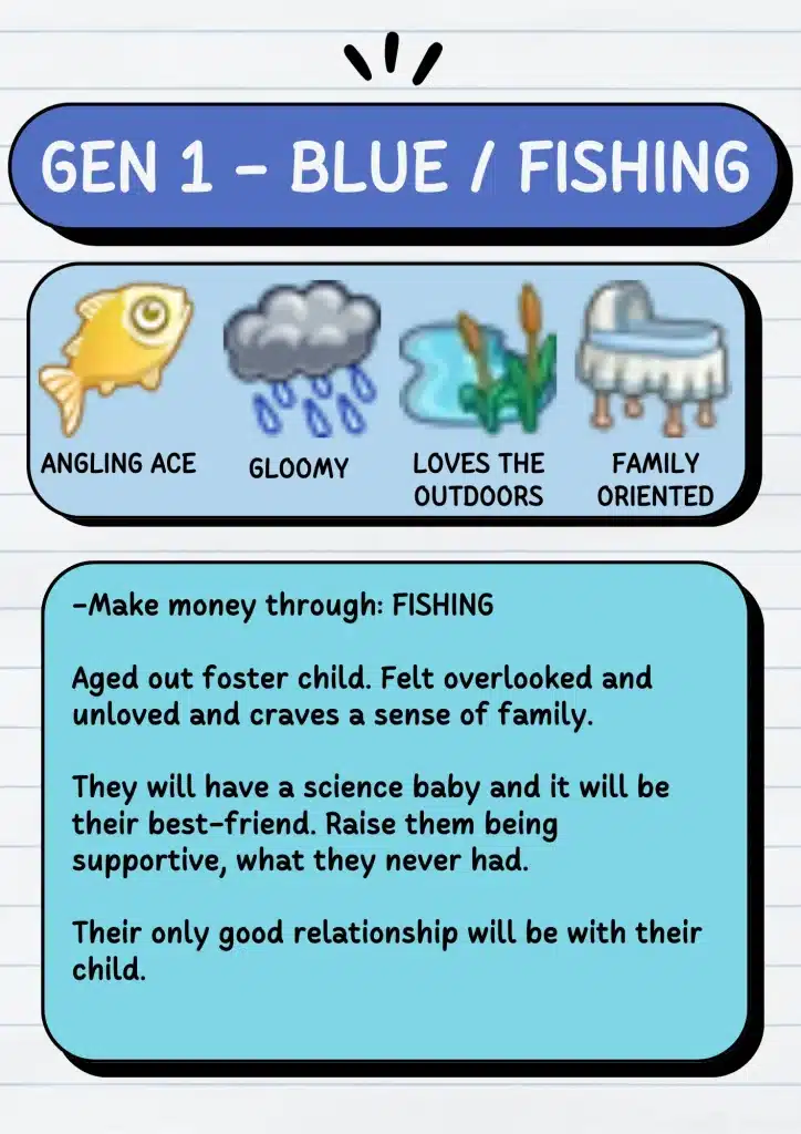Generation One (Mint) needs to be a cheerful, vegetarian scientist who marries a co-worker. Generation Two (Rose) must be a romantic politician who writes love letters and has a tumultuous love life. Each generation has this level of detail, pushing you into gameplay you’d never choose yourself.